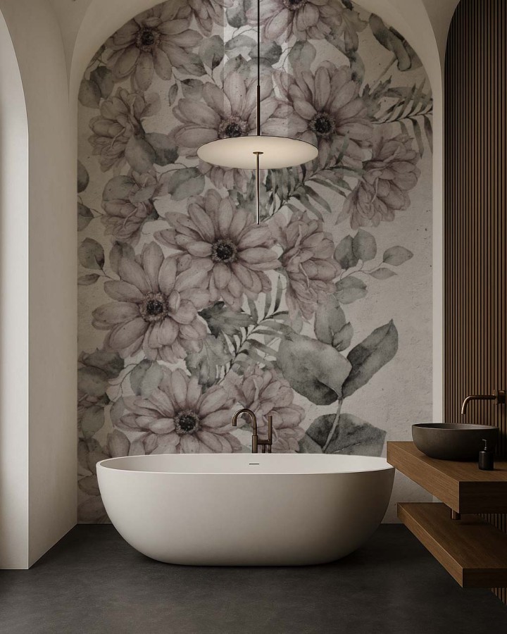 Tapeta Amelia jest wyjątkowo uniwersalna, dzięki czemu doskonale sprawdzi się w różnych aranżacjach wnętrz. W salonie może stać się centralnym elementem dekoracyjnym, który wprowadzi do przestrzeni harmonię i wyrafinowanie. Delikatne kwiaty na surowym tle dodadzą wnętrzu przytulności i ciepła, tworząc jednocześnie elegancką i stylową atmosferę.