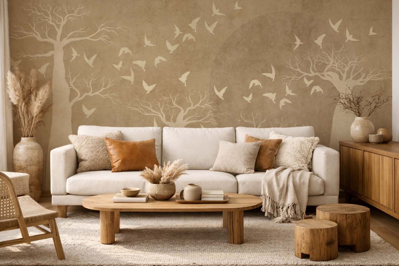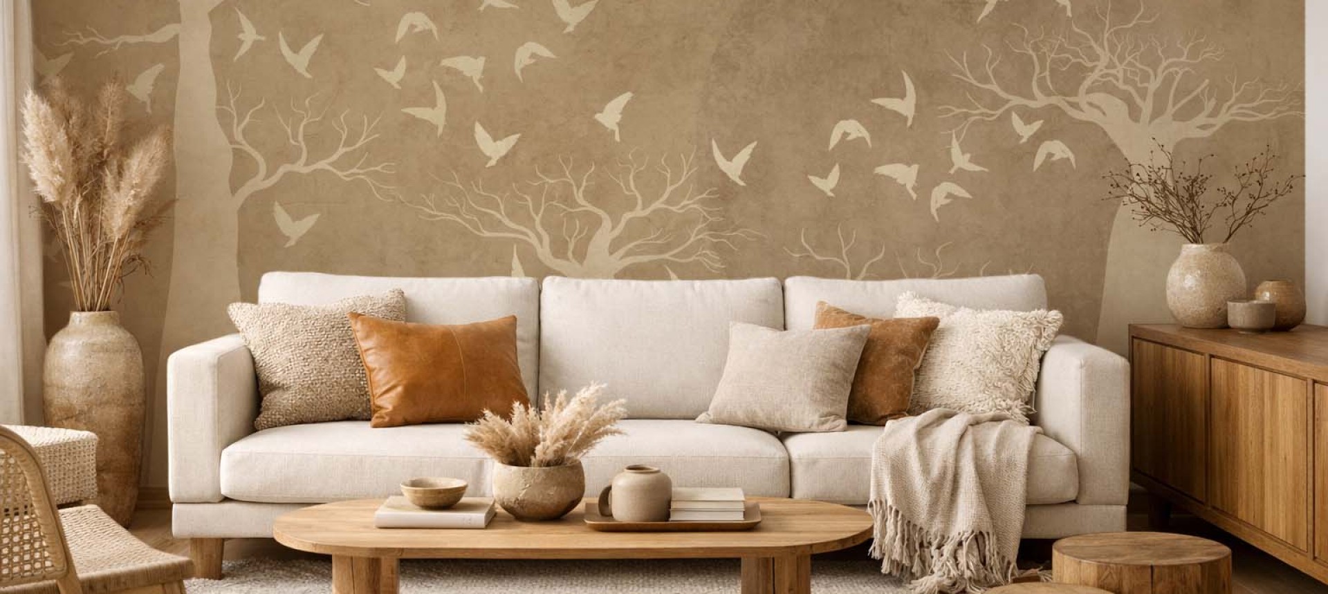 Motyw smukłych drzew o charakterystycznych koronach przywodzi na myśl krajobraz afrykańskich równin i daje wnętrzu wyjątkową głębię. Delikatny księżycowy krąg w tle oraz dynamiczna kompozycja ptaków nadają projektowi subtelny ruch i poetycki klimat.