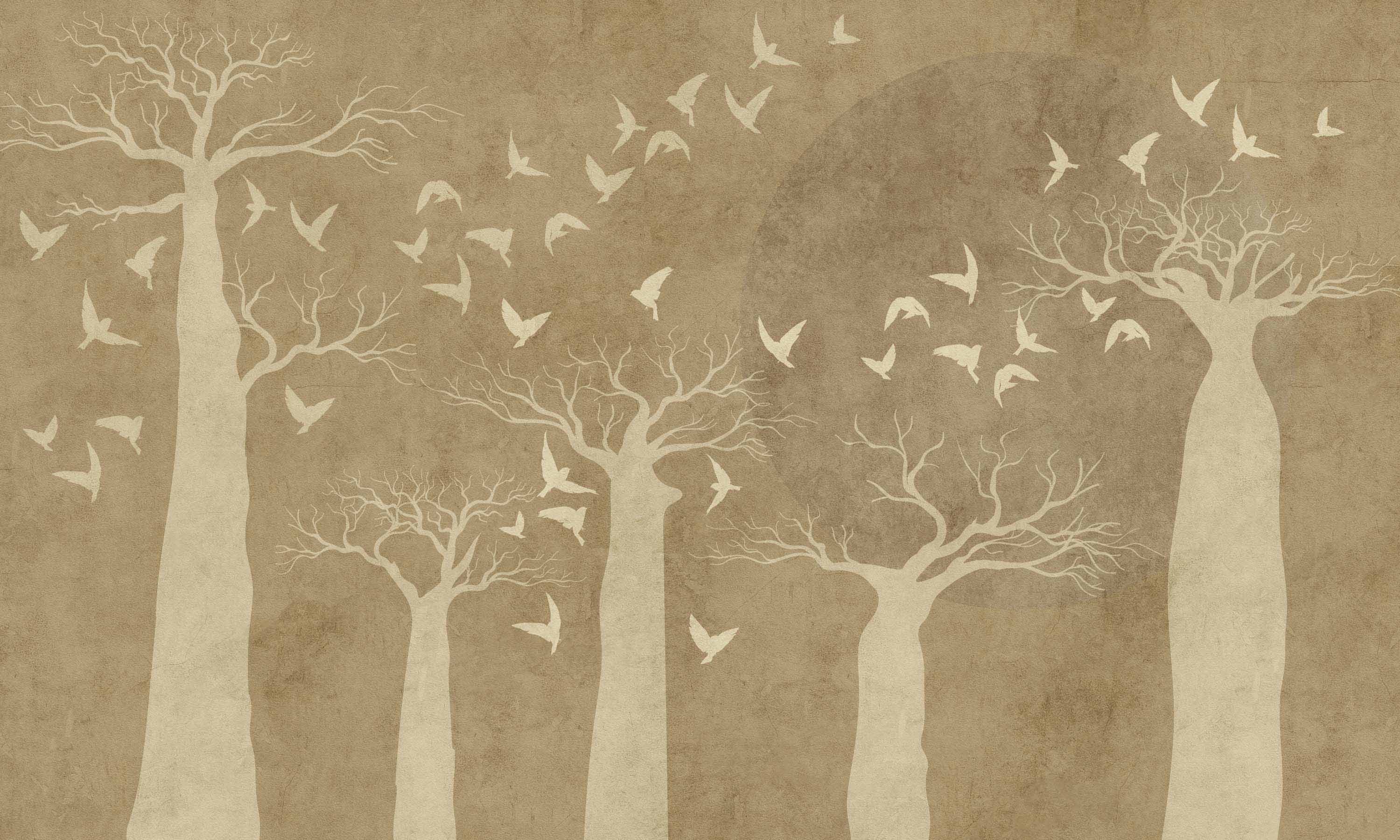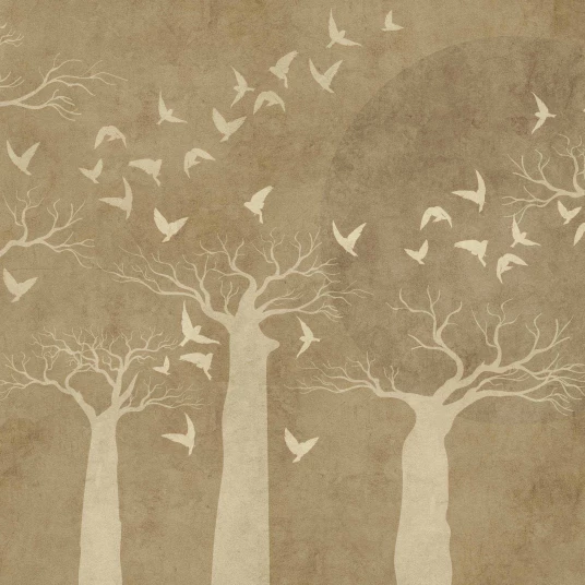 BAO to artystyczna tapeta ścienna inspirowana monumentalną formą drzew baobabu i spokojem nocnego krajobrazu. Minimalistyczna kompozycja wysokich, rzeźbiarskich pni oraz delikatnie unoszących się ptaków tworzy atmosferę ciszy, przestrzeni i naturalnej harmonii. Subtelna struktura tła przypominająca patynowany tynk nadaje całości elegancki, architektoniczny charakter.