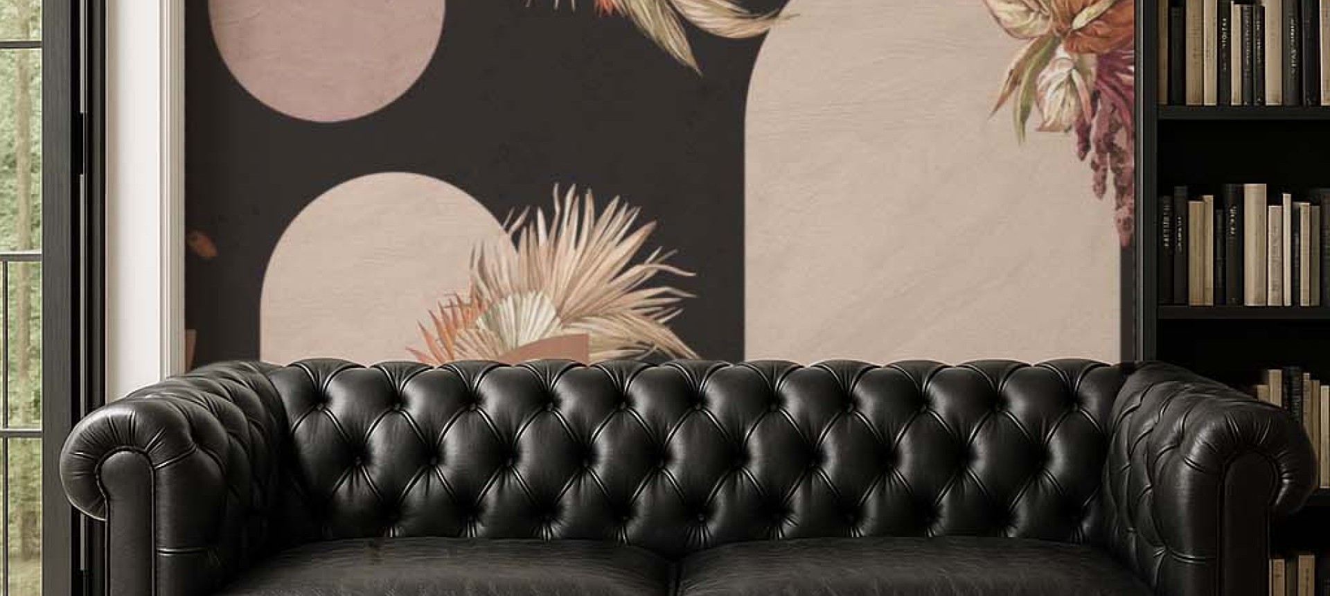 Tapeta Bari to niezwykły i oryginalny wybór, który wprowadzi do Twojego wnętrza niepowtarzalny klimat. Ten wzór, inspirowany elegancją i egzotyką, łączy w sobie harmonijne połączenie geometrycznych łuków, bujnych liści oraz pięknych kwiatów, wszystko to osadzone na głębokim czarnym tle.