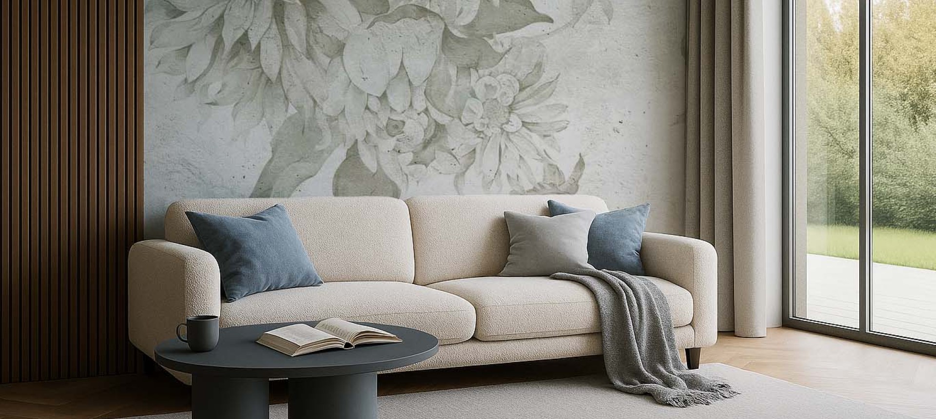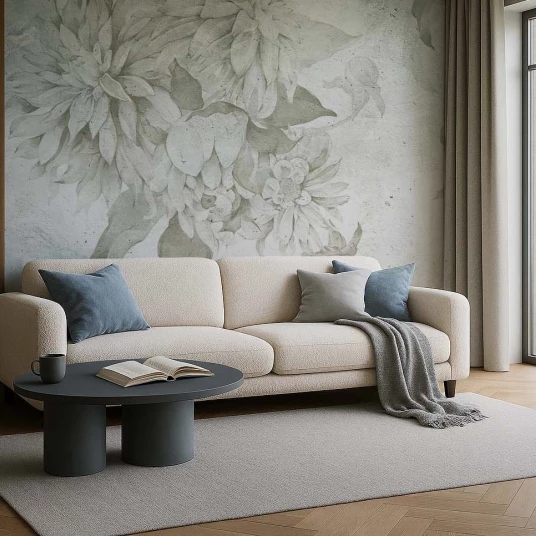 Tapeta Blanka, to wyjątkowy piękny dekor na ścianę. Szukasz tapety w kwiaty? Świetnie trafiłeś! Duże kwiaty na ścianie optycznie powiększą wnętrze, a delikatne odcienie zieleni i niebieskiego rozjaśniają pokój. Dzięki jasnym kolorom na tapecie wprowadzisz do swojego wnętrza spokojną i przytulną atmosferę.