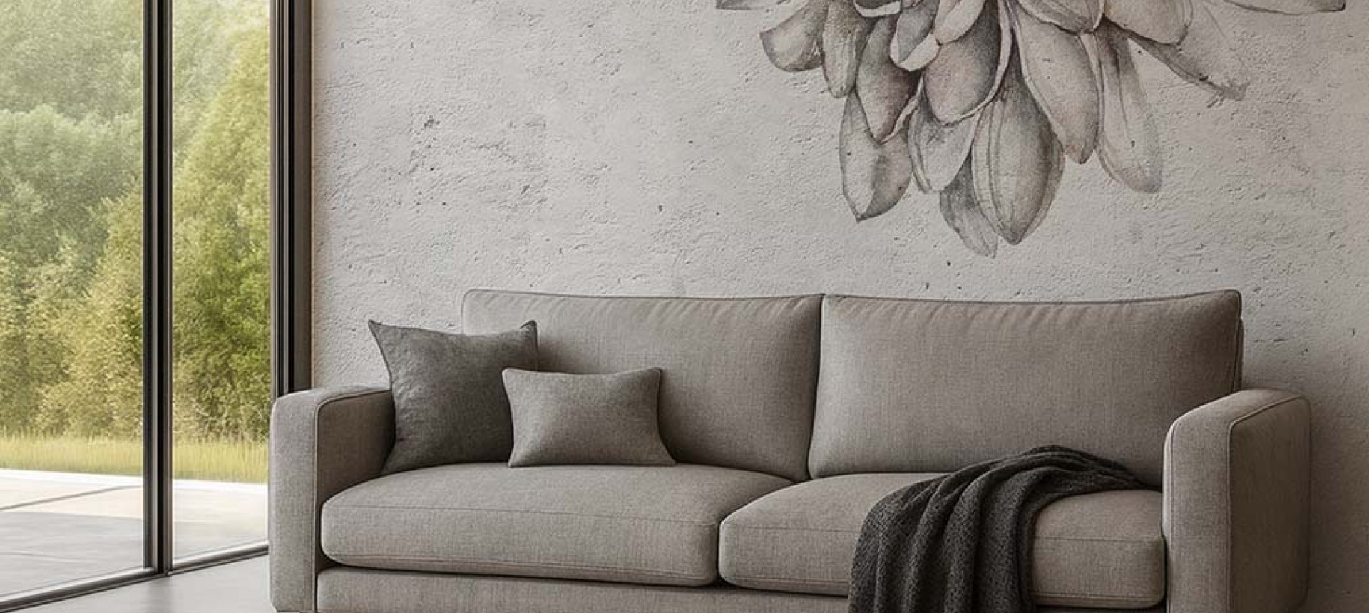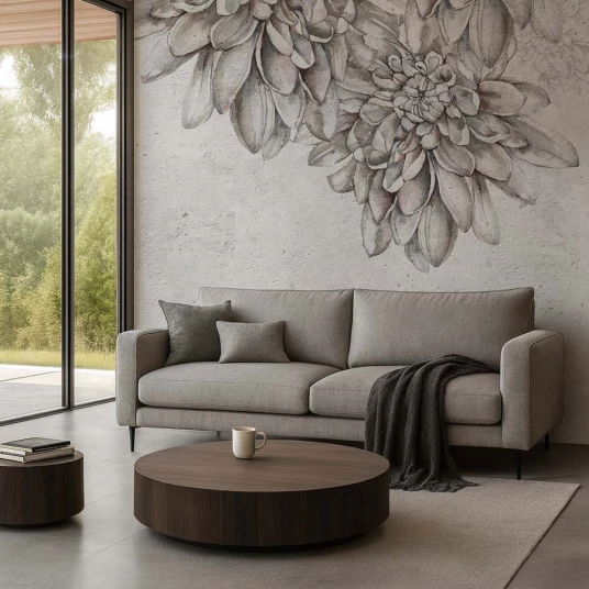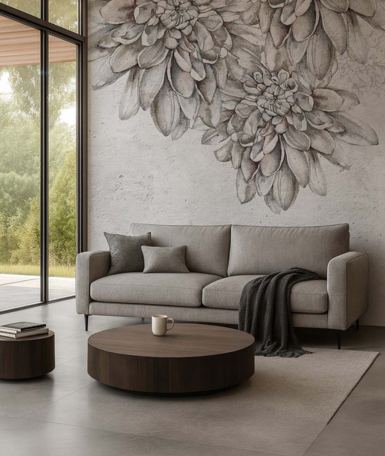 Jednak tapeta Carmen kryje w sobie coś więcej niż tylko surowość betonu. Na tym tle subtelnie zarysowane są delikatne kwiaty, które dodają całości wyrafinowanej elegancji i uroku. Te kwiatowe motywy, choć subtelne i stonowane, wprowadzają do wnętrza element natury, łagodząc chłód betonu i tworząc harmonijną kompozycję. Dzięki temu tapeta Carmen łączy w sobie dwa pozornie przeciwstawne światy – industrialny minimalizm i delikatną, romantyczną estetykę.