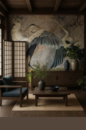 Tapeta „Gandi” to wyjątkowy wybór dla miłośników natury, spokoju i elegancji. Jej delikatny, inspirowany sztuką Dalekiego Wschodu wzór przedstawia stado ptaków w locie na tle subtelnych gałęzi bambusa i lekko rozmytego księżyca. Taka kompozycja wprowadza do wnętrza harmonię i lekkość, tworząc atmosferę sprzyjającą relaksowi. Stonowana paleta barw w odcieniach beżu, czerni i ciepłego pomarańczu sprawia, że tapeta pasuje do wielu aranżacji – od stylu boho i japandi po klasyczne i nowoczesne wnętrza.