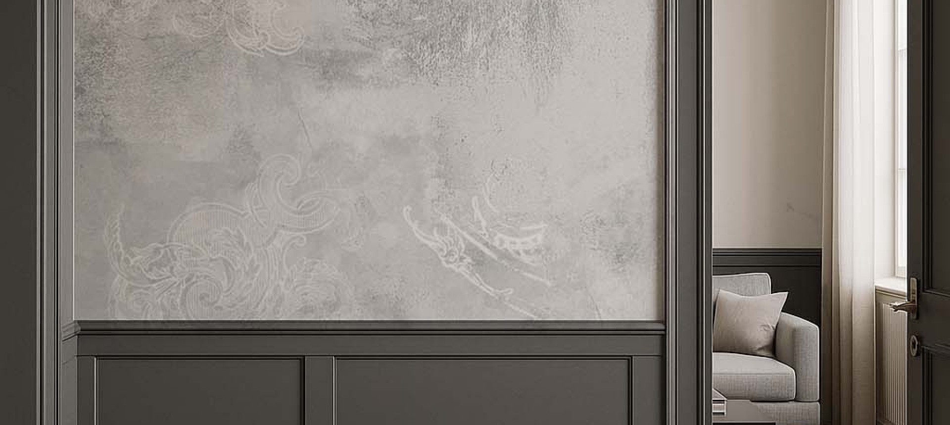 Tapeta Gloria to surowość i prostota w eleganckim wydaniu. Wzór tej tapety przedstawia betonowe tło okraszone barokowymi ornamentami. Całość obrazu jest bardzo minimalistyczna i nie przytłacza. Tapeta Gloria będzie pięknym dopełnieniem dekoracji salonu lub sypialni.
