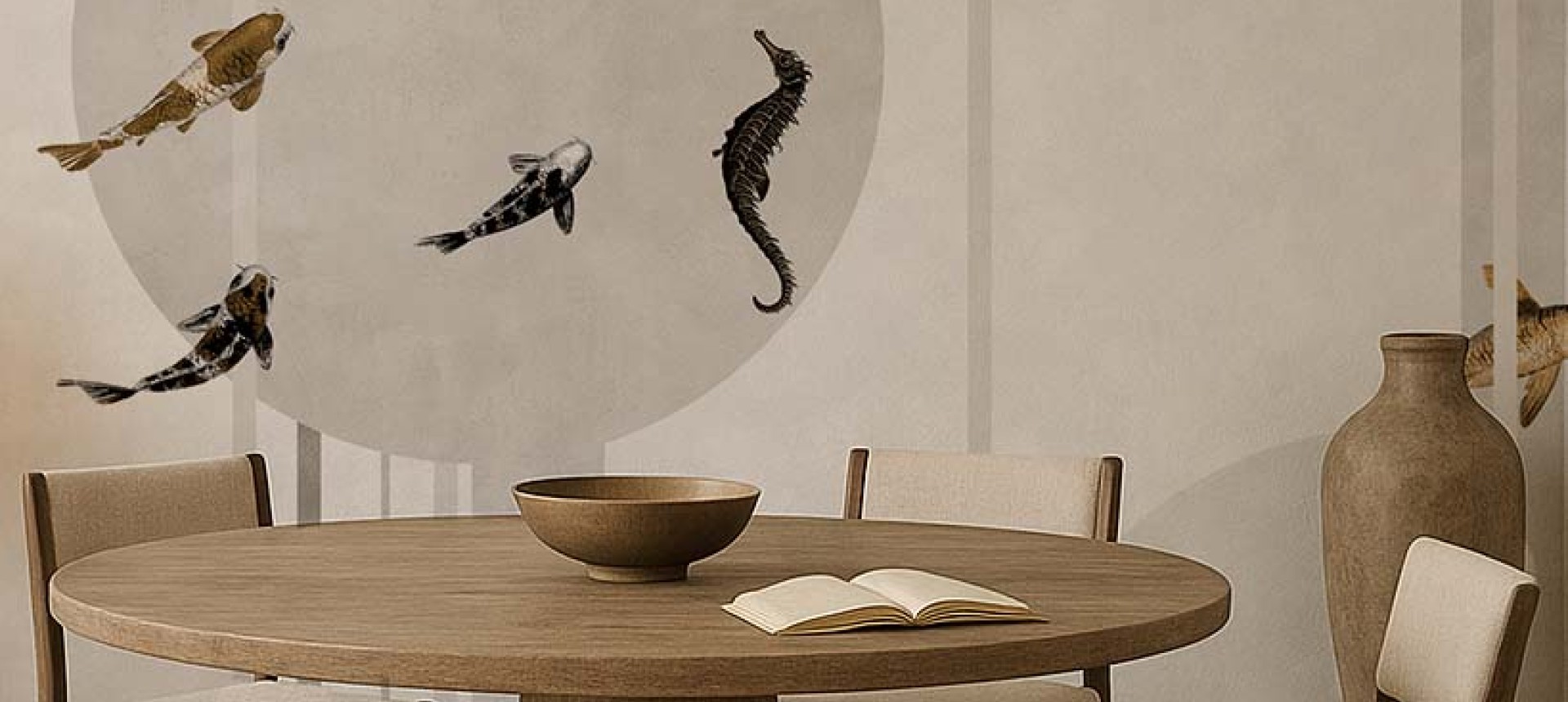 Tapeta Koi to połączenie eleganckiej geometrii i odrobiny podwodnego świata. Znajdziecie tu kolorowe rybki płynące w górę geometrycznej rzeki. Tapeta Koi wpisze się w minimalistyczne wnętrza, będzie też świetnym dekorem na jednej ze ścian w łazience.