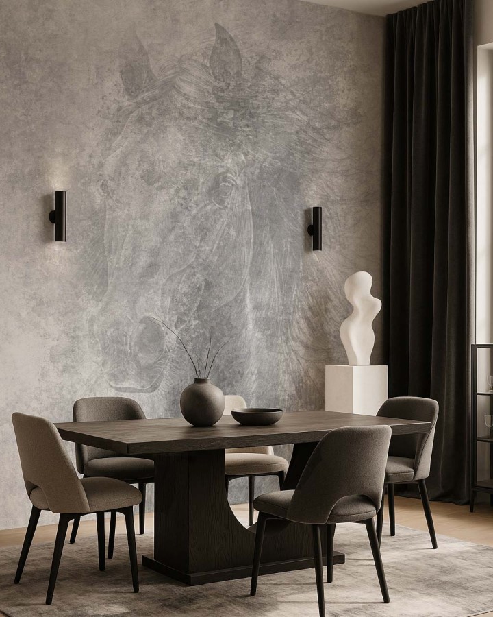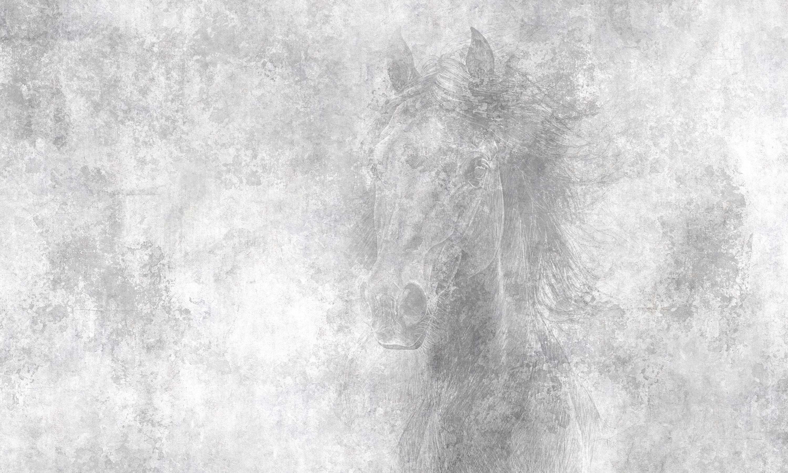 Tapeta Lior to wyjątkowe połączenie sztuki i elegancji. Na jej powierzchni subtelnie zarysowuje się wizerunek konia – symbolu siły, wolności i majestatu. Delikatnie szkicowana sylwetka wtapia się w szlachetne, betonowe tło, tworząc niezwykle artystyczną kompozycję. Dzięki tej grze faktur i odcieni szarości wzór wygląda jak dzieło wykonane ołówkiem na płótnie, emanując spokojem i ponadczasowym pięknem.
