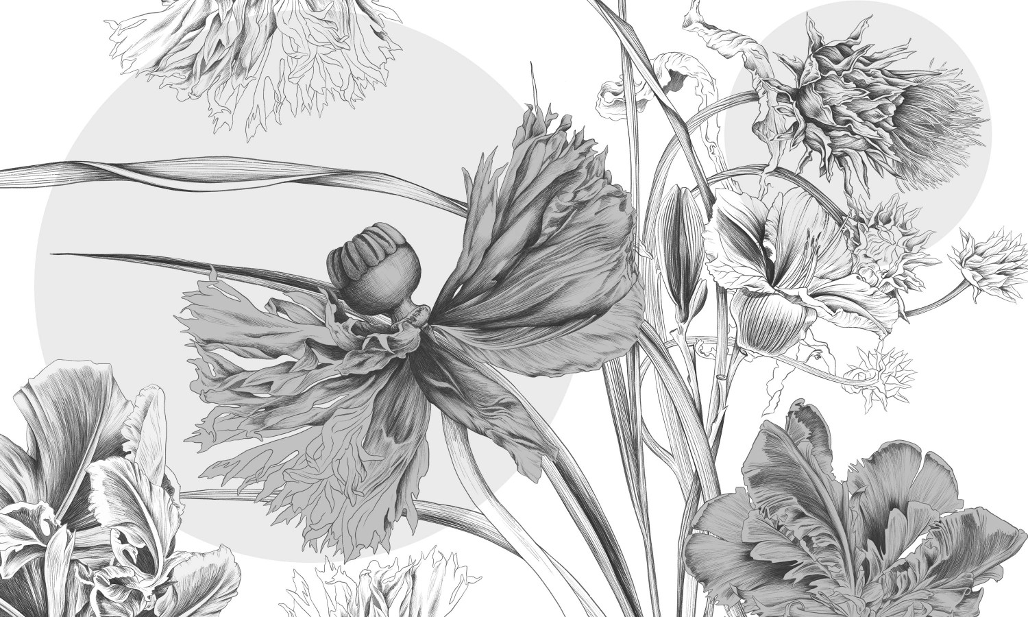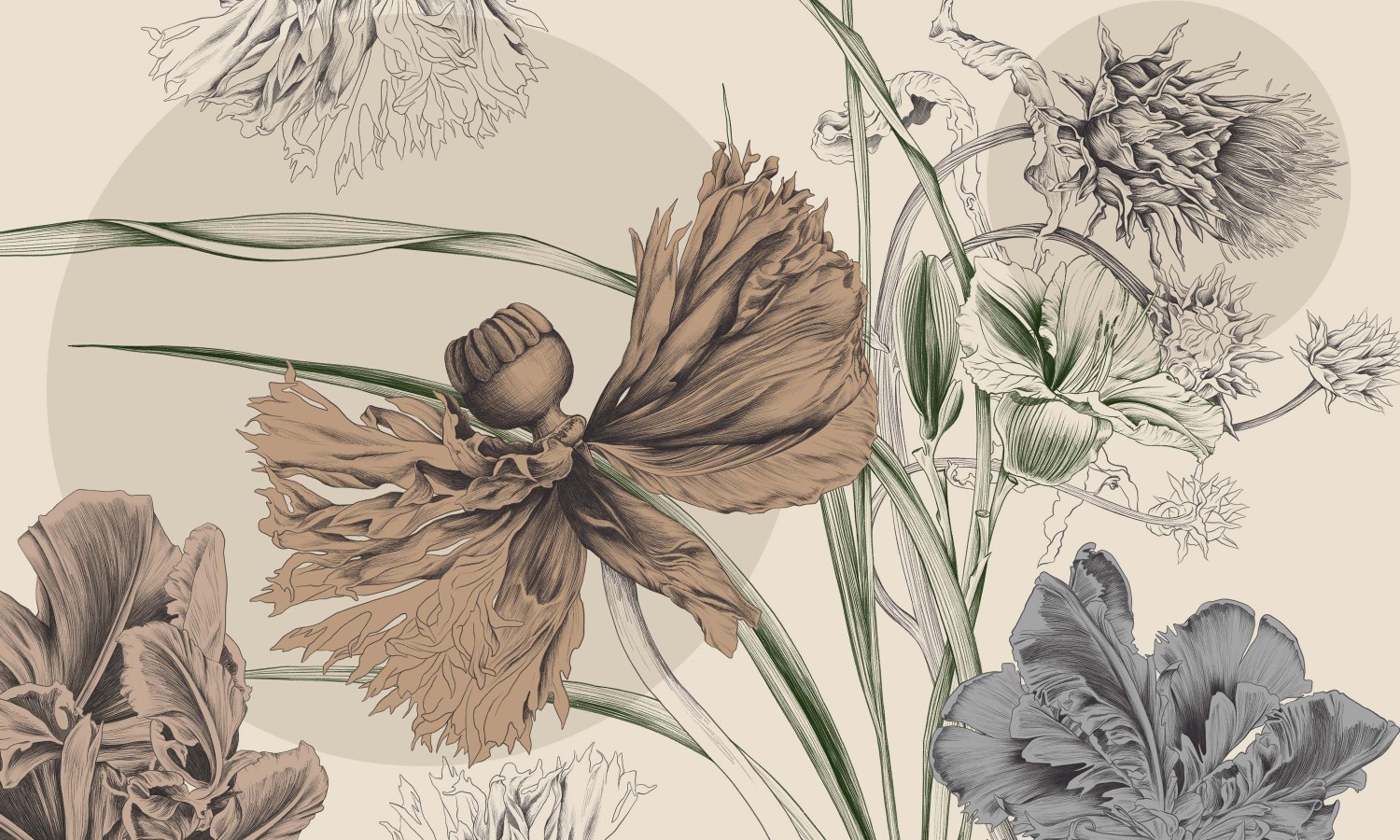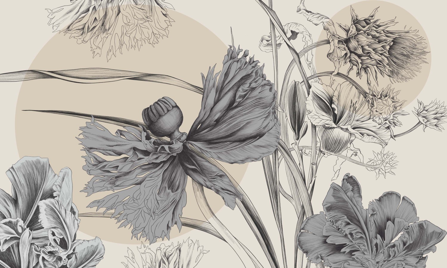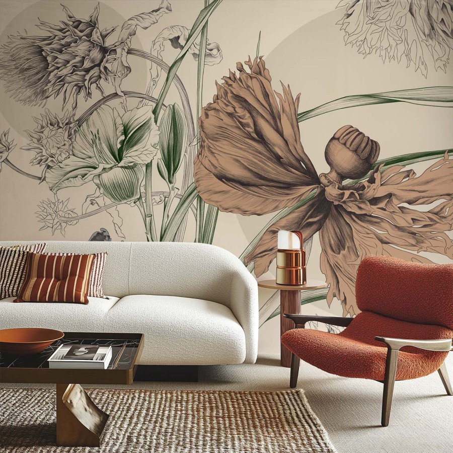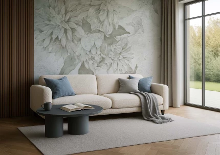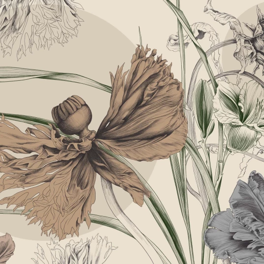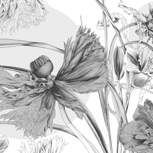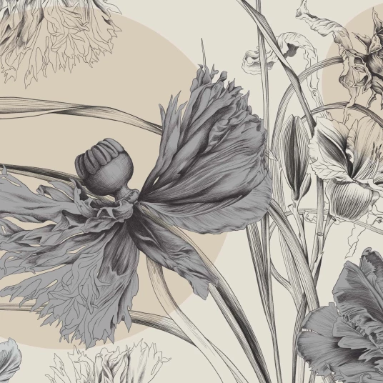 Tapeta „Nimfa” to połączenie sztuki botanicznej i ponadczasowej elegancji. Jej unikalny wzór inspirowany jest pięknem natury – przedstawia duże, misternie rysowane kwiaty o organicznych kształtach, które tworzą efektowną, ale jednocześnie subtelną dekorację ściany. Detale liści i płatków są wykonane z niezwykłą precyzją, co nadaje całości głębi i artystycznego charakteru.
