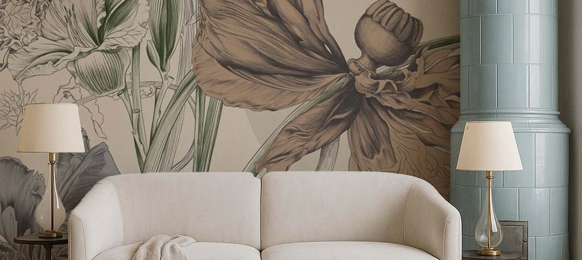 Bazą kolorystyczną jest ciepły beż, który idealnie komponuje się z naturalnymi odcieniami zieleni, brązu oraz terakoty. Taka paleta barw sprawia, że tapeta wprowadza do wnętrza przytulną atmosferę i pasuje zarówno do klasycznych, jak i nowoczesnych aranżacji. Doskonale sprawdzi się w salonie, sypialni, gabinecie czy eleganckiej jadalni, nadając przestrzeni wyrafinowanego charakteru.
