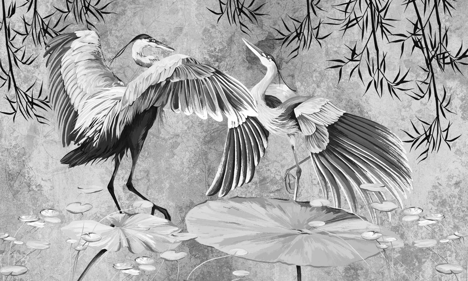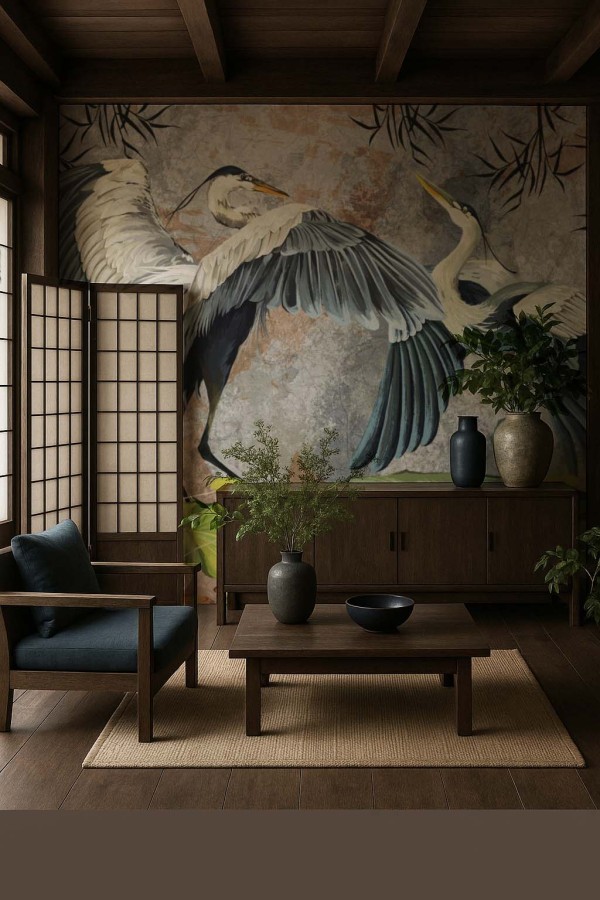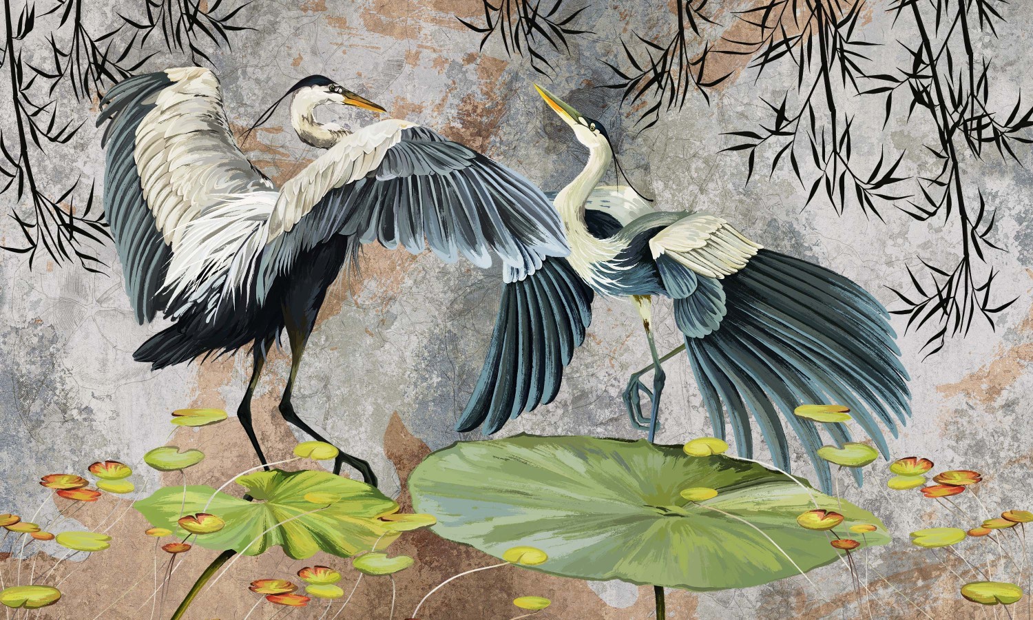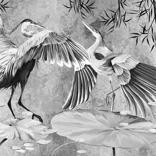 - Egzotyczny design – centralnym motywem tapety są dwa czaple (żurawie), symbolizujące szczęście i długowieczność, które pięknie współgrają z liśćmi lotosu oraz kaskadowymi gałązkami bambusa. Tapeta wprowadza do pomieszczenia orientalny, a zarazem nowoczesny charakter.